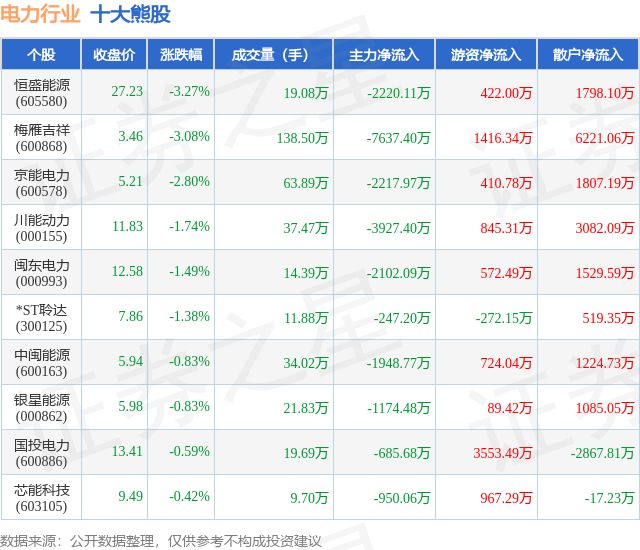 个股表现方面,电力行业当日领跌股为恒盛能源(605580),该股当日报收27.23,下跌3.27%,成交量19.08万,主力资金净流出2220.11万元。梅雁吉祥(600868)以下跌3.08%紧随其后,该股当日成交量138.5万,主力资金净流出7637.4万元。除此之外,京能电力(600578)、川能动力(000155)、闽东电力(000993)均进入当日熊股之列。具体个股列表见下表: