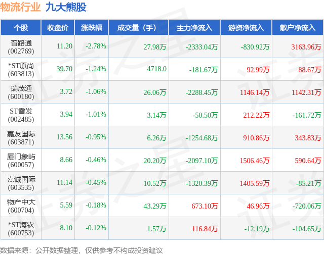 个股表现方面,物流行业当日领跌股为普路通(002769),该股当日报收11.2,下跌2.78%,成交量27.98万,主力资金净流出2333.04万元。*ST原尚(603813)以下跌1.24%紧随其后,该股当日成交量4718.0,主力资金净流出181.67万元。除此之外,瑞茂通(600180)、ST雪发(002485)、嘉友国际(603871)均进入当日熊股之列。具体个股列表见下表: