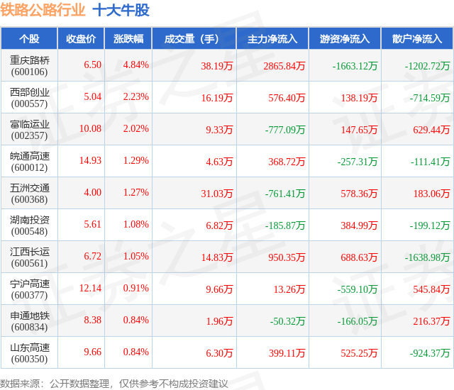 个股表现方面,铁路公路行业当日领涨股为重庆路桥(600106),该股当日报收6.5,上涨4.84%,成交量38.19万,主力资金净流入2865.84万元。西部创业(000557)以上涨2.23%紧随其后,该股当日成交量16.19万,主力资金净流入576.4万元。除此之外,富临运业(002357)、皖通高速(600012)、五洲交通(600368)均进入当日牛股之列。具体个股列表见下表:
