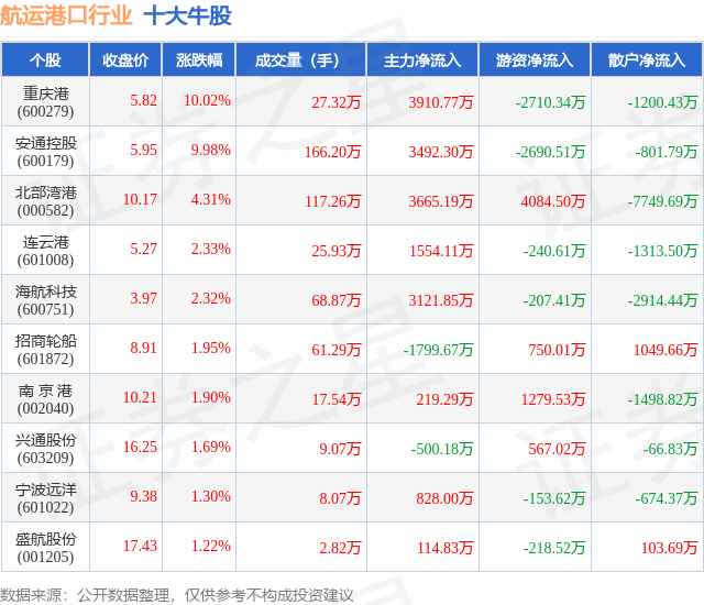 个股表现方面,航运港口行业当日领涨股为重庆港(600279),该股当日报收5.82,上涨10.02%,成交量27.32万,主力资金净流入3910.77万元。安通控股(600179)以上涨9.98%紧随其后,该股当日成交量166.2万,主力资金净流入3492.3万元。除此之外,北部湾港(000582)、连云港(601008)、海航科技(600751)均进入当日牛股之列。具体个股列表见下表: