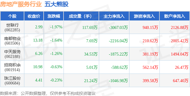 个股表现方面,房地产服务行业当日领跌股为世联行(002285),该股当日报收2.99,下跌1.97%,成交量117.69万,主力资金净流出3067.03万元。南都物业(603506)以下跌1.64%紧随其后,该股当日成交量7.69万,主力资金净流出2216.04万元。除此之外,中天服务(002188)、招商积余(001914)、珠江股份(600684)均进入当日熊股之列。具体个股列表见下表:
