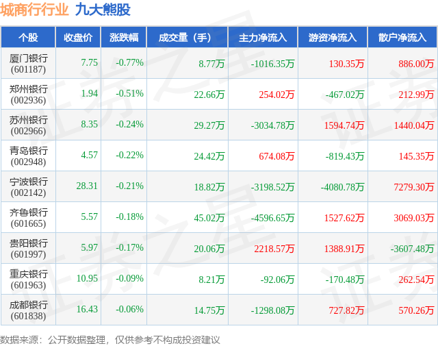 个股表现方面,城商行行业当日领跌股为厦门银行(601187),该股当日报收7.75,下跌0.77%,成交量8.77万,主力资金净流出1016.35万元。郑州银行(002936)以下跌0.51%紧随其后,该股当日成交量22.66万,主力资金净流入254.02万元。除此之外,苏州银行(002966)、青岛银行(002948)、宁波银行(002142)均进入当日熊股之列。具体个股列表见下表: