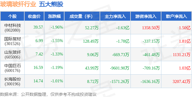 个股表现方面,玻璃玻纤行业当日领跌股为中材科技(002080),该股当日报收39.57,下跌1.96%,成交量52.27万,主力资金净流出1.63亿元。国际复材(301526)以下跌1.55%紧随其后,该股当日成交量128.49万,主力资金净流出1.78亿元。除此之外,山东玻纤(605006)、中国巨石(600176)、长海股份(300196)均进入当日熊股之列。具体个股列表见下表: