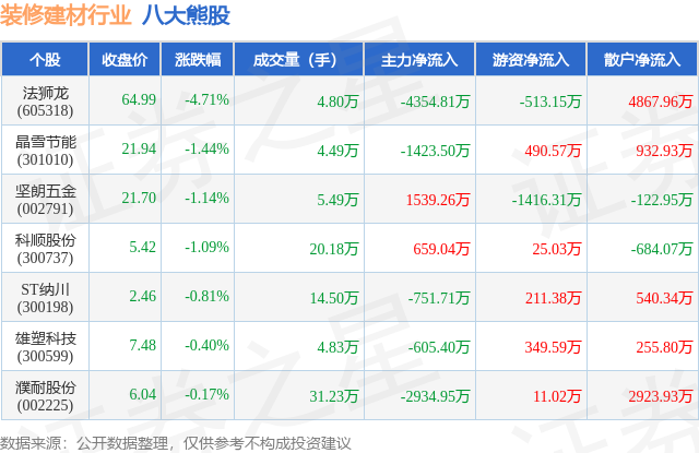 个股表现方面,装修建材行业当日领跌股为法狮龙(605318),该股当日报收64.99,下跌4.71%,成交量4.8万,主力资金净流出4354.81万元。晶雪节能(301010)以下跌1.44%紧随其后,该股当日成交量4.49万,主力资金净流出1423.5万元。除此之外,坚朗五金(002791)、科顺股份(300737)、ST纳川(300198)均进入当日熊股之列。具体个股列表见下表: