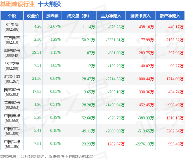 个股表现方面,基础建设行业当日领跌股为ST围海(002586),该股当日报收4.26,下跌2.07%,成交量11.14万,主力资金净流出878.28万元。东方园林(002310)以下跌1.29%紧随其后,该股当日成交量50.21万,主力资金净流出3331.31万元。除此之外,奥雅股份(300949)、*ST交投(002200)、汇绿生态(001267)均进入当日熊股之列。具体个股列表见下表: