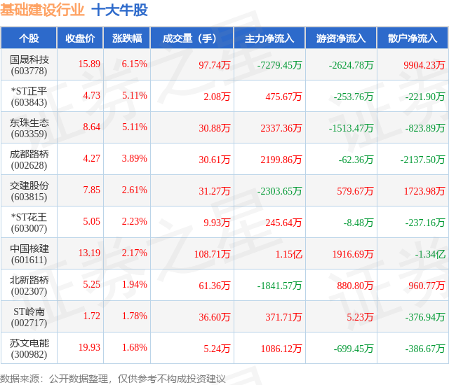 个股表现方面,基础建设行业当日领涨股为国晟科技(603778),该股当日报收15.89,上涨6.15%,成交量97.74万,主力资金净流出7279.45万元。*ST正平(603843)以上涨5.11%紧随其后,该股当日成交量2.08万,主力资金净流入475.67万元。除此之外,东珠生态(603359)、成都路桥(002628)、交建股份(603815)均进入当日牛股之列。具体个股列表见下表:
