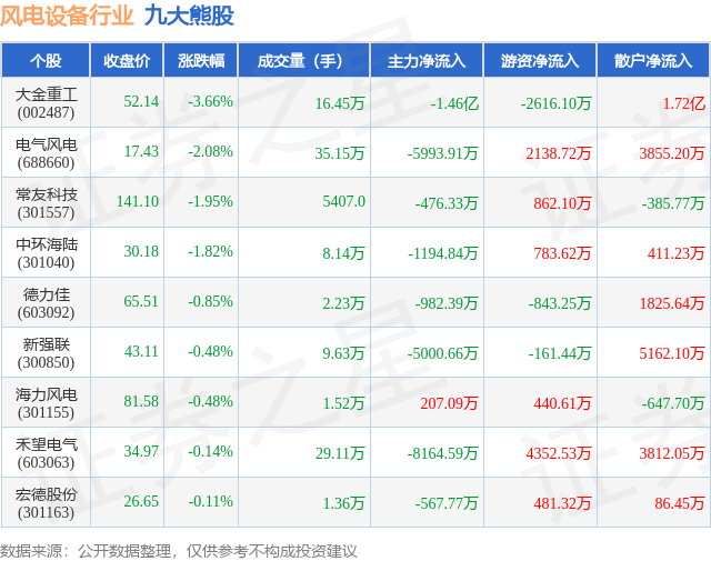 个股表现方面,风电设备行业当日领跌股为大金重工(002487),该股当日报收52.14,下跌3.66%,成交量16.45万,主力资金净流出1.46亿元。电气风电(688660)以下跌2.08%紧随其后,该股当日成交量35.15万,主力资金净流出5993.91万元。除此之外,常友科技(301557)、中环海陆(301040)、德力佳(603092)均进入当日熊股之列。具体个股列表见下表:
