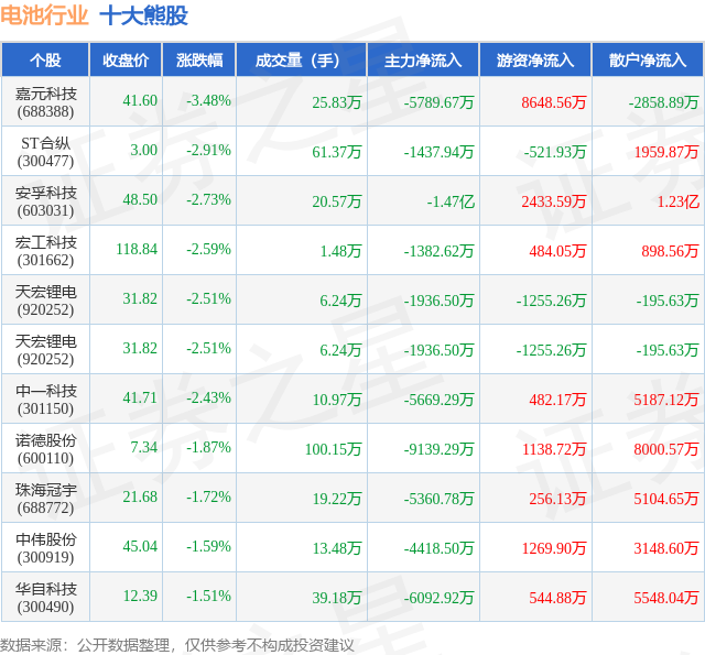 个股表现方面,电池行业当日领跌股为嘉元科技(688388),该股当日报收41.6,下跌3.48%,成交量25.83万,主力资金净流出5789.67万元。ST合纵(300477)以下跌2.91%紧随其后,该股当日成交量61.37万,主力资金净流出1437.94万元。除此之外,安孚科技(603031)、宏工科技(301662)、天宏锂电(920252)均进入当日熊股之列。具体个股列表见下表:
