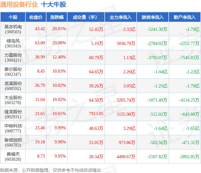 个股表现方面,通用设备行业当日领涨股为昊志机电(300503),该股当日报收43.42,上涨20.01%,成交量52.45万,主力资金净流入2.32亿元。绿岛风(301043)以上涨20.0%紧随其后,该股当日成交量5.19万,主力资金净流入5036.79万元。除此之外,力星股份(300421)、泰尔股份(002347)、龙溪股份(600592)均进入当日牛股之列。具体个股列表见下表: