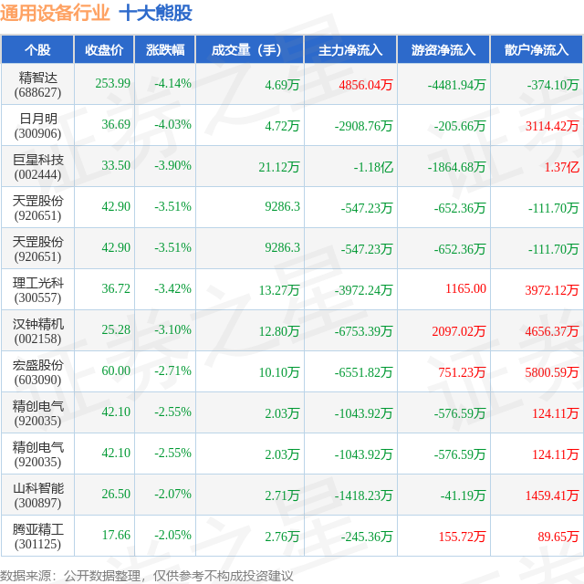 个股表现方面,通用设备行业当日领跌股为精智达(688627),该股当日报收253.99,下跌4.14%,成交量4.69万,主力资金净流入4856.04万元。日月明(300906)以下跌4.03%紧随其后,该股当日成交量4.72万,主力资金净流出2908.76万元。除此之外,巨星科技(002444)、天罡股份(920651)、天罡股份(920651)均进入当日熊股之列。具体个股列表见下表: