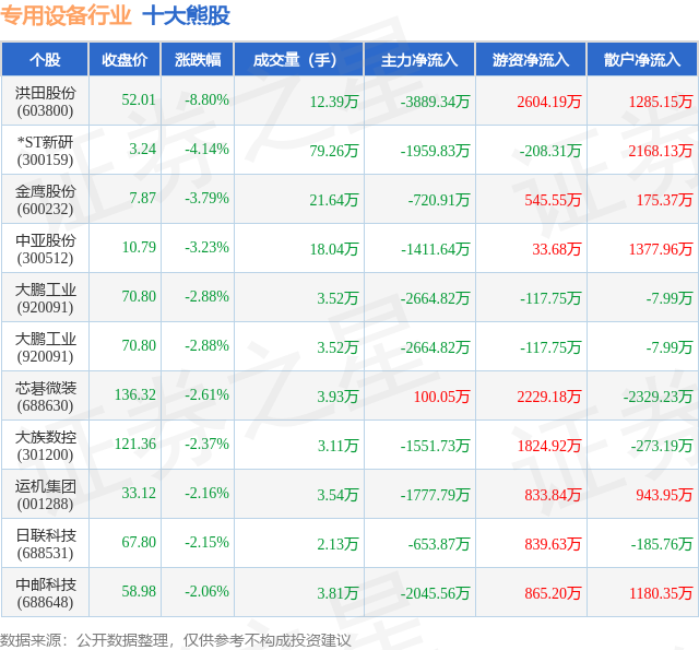 个股表现方面,专用设备行业当日领跌股为洪田股份(603800),该股当日报收52.01,下跌8.8%,成交量12.39万,主力资金净流出3889.34万元。*ST新研(300159)以下跌4.14%紧随其后,该股当日成交量79.26万,主力资金净流出1959.83万元。除此之外,金鹰股份(600232)、中亚股份(300512)、大鹏工业(920091)均进入当日熊股之列。具体个股列表见下表: