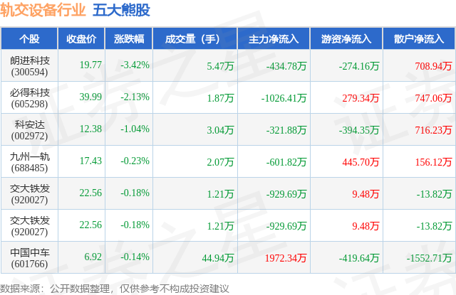 个股表现方面,轨交设备行业当日领跌股为朗进科技(300594),该股当日报收19.77,下跌3.42%,成交量5.47万,主力资金净流出434.78万元。必得科技(605298)以下跌2.13%紧随其后,该股当日成交量1.87万,主力资金净流出1026.41万元。除此之外,科安达(002972)、九州一轨(688485)、交大铁发(920027)均进入当日熊股之列。具体个股列表见下表: