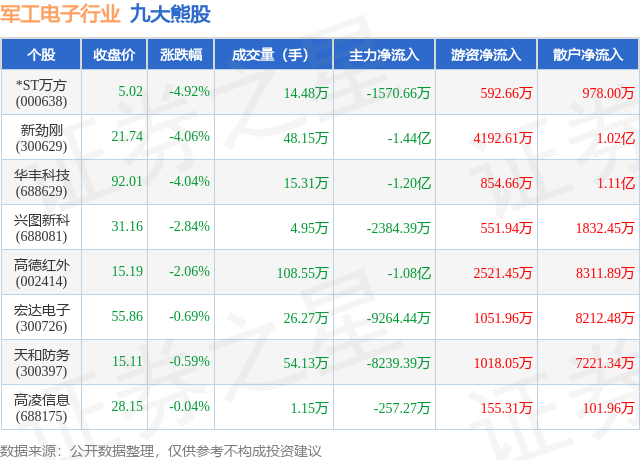 个股表现方面,军工电子行业当日领跌股为*ST万方(000638),该股当日报收5.02,下跌4.92%,成交量14.48万,主力资金净流出1570.66万元。新劲刚(300629)以下跌4.06%紧随其后,该股当日成交量48.15万,主力资金净流出1.44亿元。除此之外,华丰科技(688629)、兴图新科(688081)、高德红外(002414)均进入当日熊股之列。具体个股列表见下表: