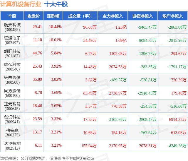 个股表现方面,计算机设备行业当日领涨股为航天智装(300455),该股当日报收29.41,上涨10.44%,成交量96.05万,主力资金净流入1.23亿元。证通电子(002197)以上涨10.01%紧随其后,该股当日成交量54.49万,主力资金净流入1.09亿元。除此之外,凯旺科技(301182)、雄帝科技(300546)、维宏股份(300508)均进入当日牛股之列。具体个股列表见下表: