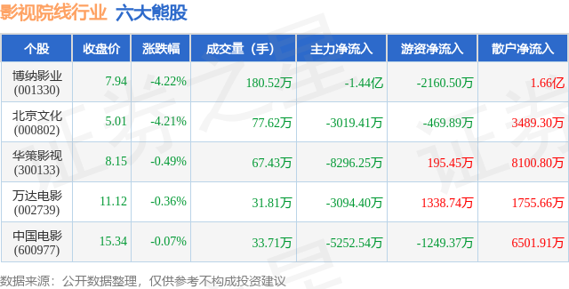个股表现方面,影视院线行业当日领跌股为博纳影业(001330),该股当日报收7.94,下跌4.22%,成交量180.52万,主力资金净流出1.44亿元。北京文化(000802)以下跌4.21%紧随其后,该股当日成交量77.62万,主力资金净流出3019.41万元。除此之外,华策影视(300133)、万达电影(002739)、中国电影(600977)均进入当日熊股之列。具体个股列表见下表: