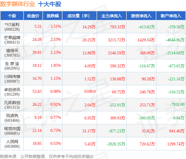 个股表现方面,数字媒体行业当日领涨股为*ST返利(600228),该股当日报收5.31,上涨3.51%,成交量14.29万,主力资金净流入793.32万元。芒果超媒(300413)以上涨2.53%紧随其后,该股当日成交量20.25万,主力资金净流入3215.72万元。除此之外,值得买(300785)、生 意 宝(002095)、川网传媒(300987)均进入当日牛股之列。具体个股列表见下表: