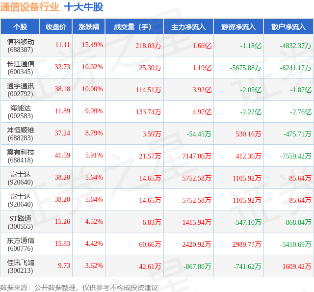 个股表现方面,通信设备行业当日领涨股为信科移动(688387),该股当日报收11.11,上涨15.49%,成交量218.03万,主力资金净流入1.66亿元。长江通信(600345)以上涨10.02%紧随其后,该股当日成交量25.3万,主力资金净流入1.19亿元。除此之外,通宇通讯(002792)、海能达(002583)、坤恒顺维(688283)均进入当日牛股之列。具体个股列表见下表: