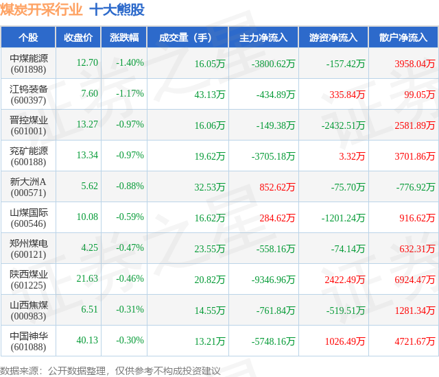个股表现方面,煤炭开采行业当日领跌股为中煤能源(601898),该股当日报收12.7,下跌1.4%,成交量16.05万,主力资金净流出3800.62万元。江钨装备(600397)以下跌1.17%紧随其后,该股当日成交量43.13万,主力资金净流出434.89万元。除此之外,晋控煤业(601001)、兖矿能源(600188)、新大洲A(000571)均进入当日熊股之列。具体个股列表见下表: