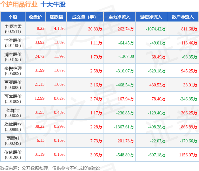个股表现方面,个护用品行业当日领涨股为中顺洁柔(002511),该股当日报收8.22,上涨4.18%,成交量30.83万,主力资金净流入262.74万元。洁雅股份(301108)以上涨1.83%紧随其后,该股当日成交量1.11万,主力资金净流出64.45万元。除此之外,润本股份(603193)、豪悦护理(605009)、百亚股份(003006)均进入当日牛股之列。具体个股列表见下表: