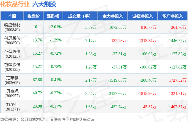 个股表现方面,化妆品行业当日领跌股为锦盛新材(300849),该股当日报收16.11,下跌2.01%,成交量3.59万,主力资金净流出1072.53万元。科思股份(300856)以下跌1.29%紧随其后,该股当日成交量7.14万,主力资金净流入132.93万元。除此之外,芭薇股份(920123)、芭薇股份(920123)、珀莱雅(603605)均进入当日熊股之列。具体个股列表见下表: