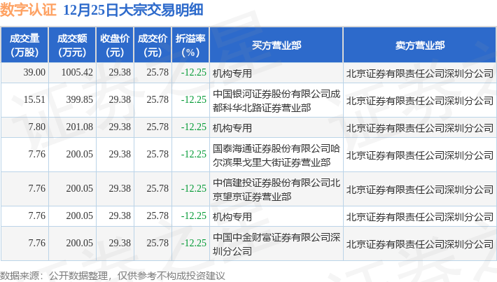证券之星消息,12月25日数字认证发生大宗交易,交易数据如下: