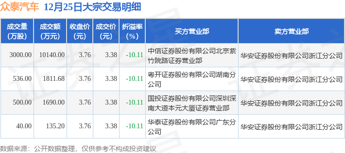 证券之星消息,12月25日众泰汽车发生大宗交易,交易数据如下:
