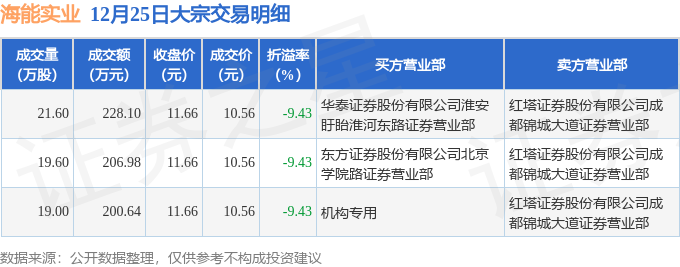 证券之星消息,12月25日海能实业发生大宗交易,交易数据如下: