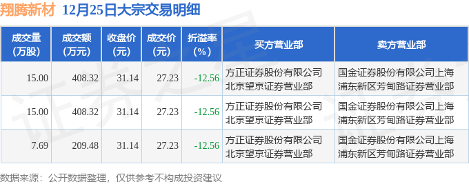 证券之星消息,12月25日翔腾新材发生大宗交易,交易数据如下: