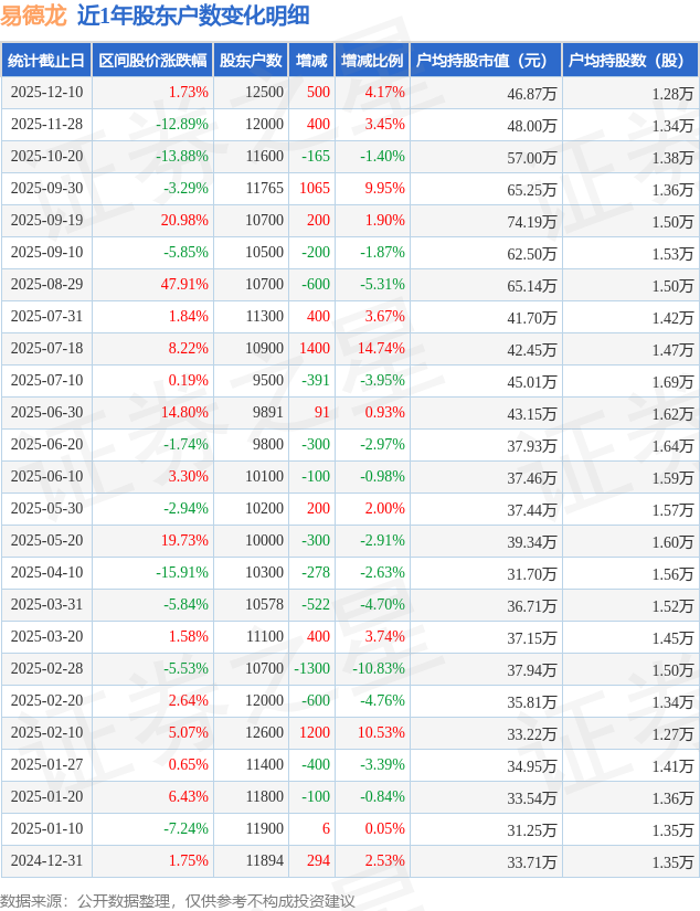 从股价来看,2025年11月28日至2025年12月10日,易德龙区间涨幅为1.73%,在此期间股东户数增加500.0户,增幅为4.17%。
