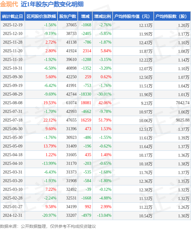 从股价来看,2025年12月10日至2025年12月19日,金现代区间跌幅为1.56%,在此期间股东户数减少1068.0户,减幅为2.76%。