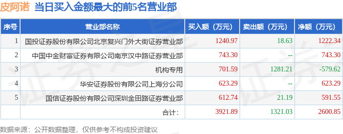 证券之星消息,沪深交易所2025年12月25日公布的交易公开信息显示,皮阿诺(002853)因日跌幅偏离值达到7%的前5只证券登上龙虎榜。此次是近5个交易日内第3次上榜。