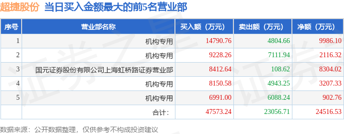 证券小知识:龙虎榜是交易所披露的竞价交易公开信息,现身龙虎榜的个股都是当日最为活跃的个股,是投资者日常重点关注的数据。交易所公布当日买入金额和卖出金额前五名的席位,其中一些席位代表特殊意义,如机构专用席位是指基金专用席位、券商自营专用席位、社保专用席位、券商理财专用席位、保险机构专用席位、保险机构租用席位、QFII专用席位等机构投资者买卖证券的专用通道和席位。深股通专用、沪股通专用为北向资金的交易席位。从龙虎榜数据可以发现和研究机构、游资和散户的资金动向。一些营业部席位经常上榜,市场知名度较高,投资者整理代表散户、游资、量化等不同资金的营业部席位。