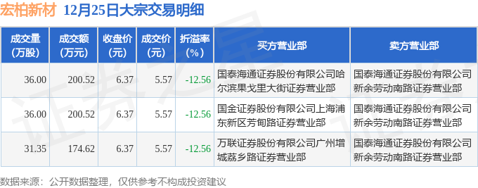 证券之星消息,12月25日宏柏新材发生大宗交易,交易数据如下: