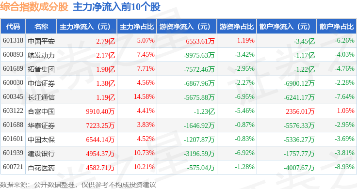 资金流向方面,综合指数(000008)成份股当日主力资金净流出合计28.65亿元,游资资金净流入合计3700.11万元,散户资金净流入合计28.28亿元。成份股资金流向详情见下表: