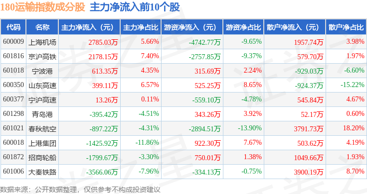 资金流向方面,180运输(000027)指数成份股当日主力资金净流出合计2.18亿元,游资资金净流出合计5038.73万元,散户资金净流入合计2.69亿元。成份股资金流向详情见下表: