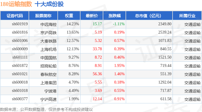 180运输(000027)指数十大成份股详情如下: