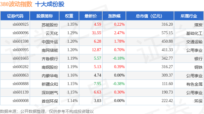 证券之星消息,12月25日,380波动(000130)指数报收于13339.86点,涨0.26%,成交188.22亿元,换手率0.74%。当日该指数成份股中,上涨的有62家,厦门国贸以9.99%的涨幅领涨,下跌的有31家,贵研铂业以4.88%的跌幅领跌。