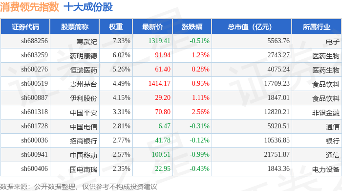 证券之星消息,12月25日,消费领先(000148)指数报收于9459.88点,涨0.24%,成交854.94亿元,换手率0.31%。当日该指数成份股中,上涨的有67家,水井坊以10.01%的涨幅领涨,下跌的有29家,芯原股份以6.82%的跌幅领跌。