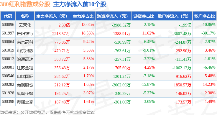 资金流向方面,380红利(000150)指数成份股当日主力资金净流出合计6388.25万元,游资资金净流出合计3874.0万元,散户资金净流入合计1.03亿元。成份股资金流向详情见下表: