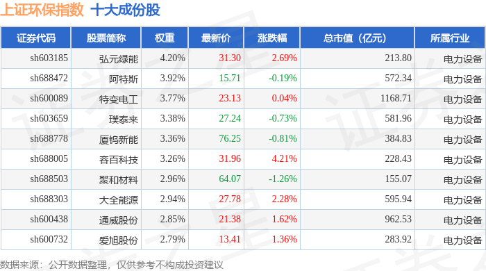 证券之星消息,12月25日,上证环保(000158)指数报收于1323.24点,涨0.44%,成交213.15亿元,换手率0.67%。当日该指数成份股中,上涨的有24家,容百科技以4.21%的涨幅领涨,下跌的有13家,奥特维以2.76%的跌幅领跌。