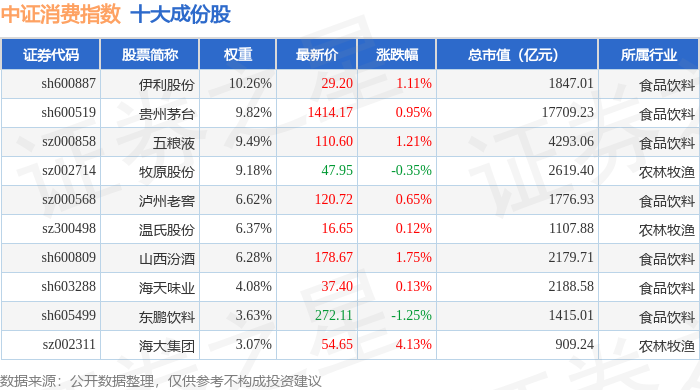 证券之星消息,12月25日,中证消费(000932)指数报收于15472.51点,涨0.72%,成交165.01亿元,换手率0.92%。当日该指数成份股中,上涨的有28家,海大集团以4.13%的涨幅领涨,下跌的有9家,海南橡胶以2.53%的跌幅领跌。