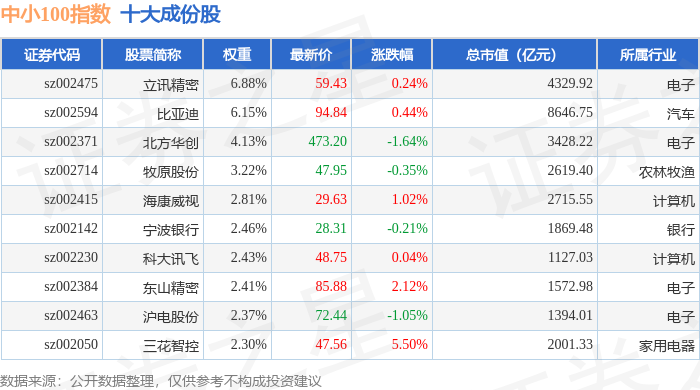 中小100(399005)指数十大成份股详情如下: