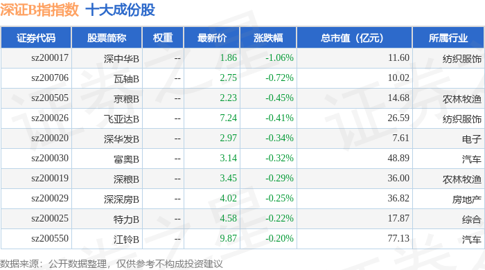 资金流向方面,深证B指(399108)指数成份股当日主力资金净流出合计43.41万元,游资资金净流入合计130.15万元,散户资金净流出合计86.74万元。成份股资金流向详情见下表: