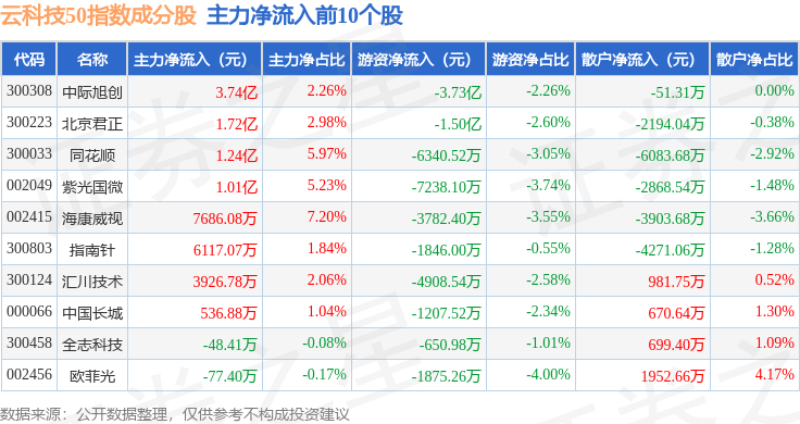 资金流向方面,云科技50(399279)指数成份股当日主力资金净流出合计30.9亿元,游资资金净流入合计6.58亿元,散户资金净流入合计24.32亿元。成份股资金流向详情见下表: