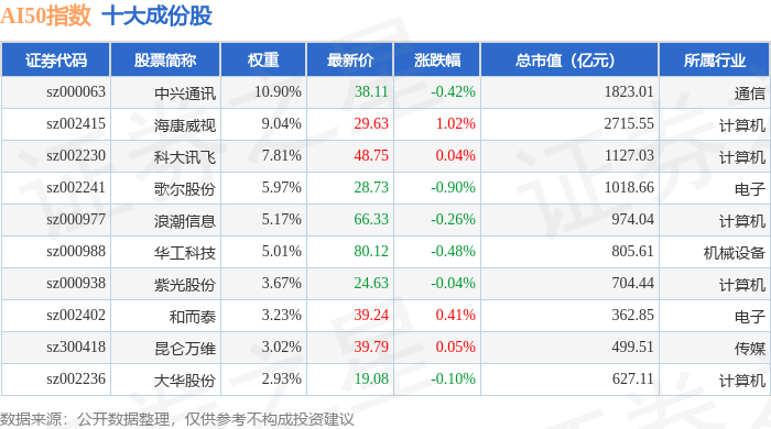 资金流向方面,AI50(399284)指数成份股当日主力资金净流出合计15.2亿元,游资资金净流入合计2.87亿元,散户资金净流入合计12.33亿元。成份股资金流向详情见下表: