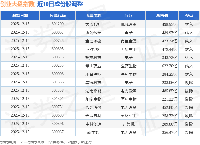 近10日内创业大盘(399293)指数成份股做了调整,新纳入了7只股票,剔除了7只股票。