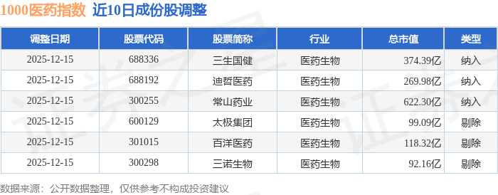 近10日内1000医药(399386)指数成份股做了调整,新纳入了3只股票,剔除了3只股票。
