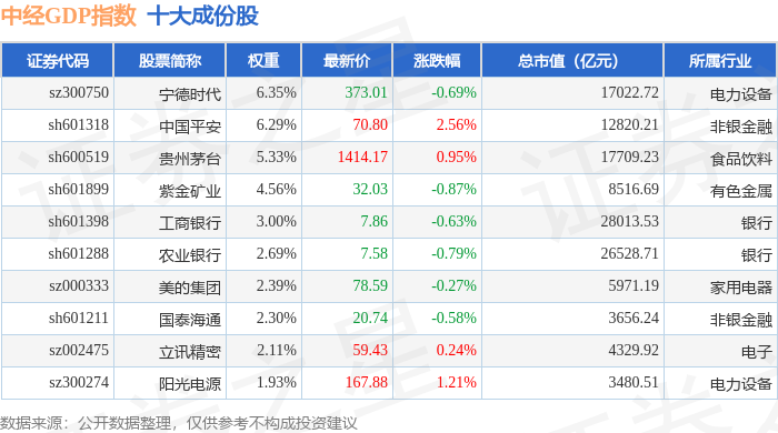 中经GDP(399399)指数十大成份股详情如下: