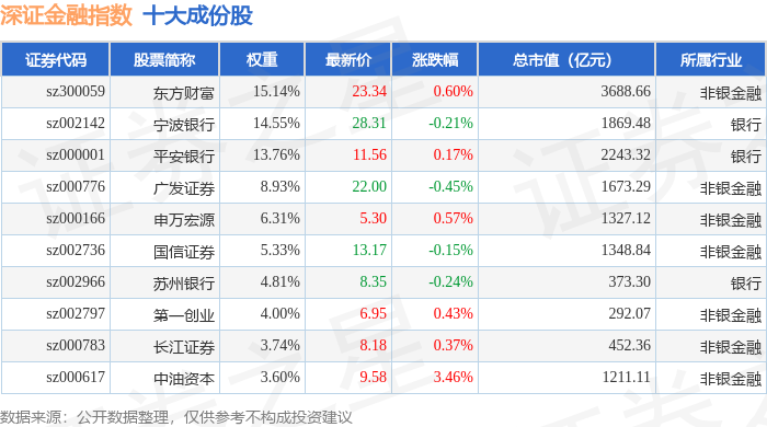 证券之星消息,12月25日,深证金融(399619)指数报收于7169.16点,涨0.33%,成交131.49亿元,换手率0.72%。当日该指数成份股中,上涨的有14家,中油资本以3.46%的涨幅领涨,下跌的有5家,广发证券以0.45%的跌幅领跌。