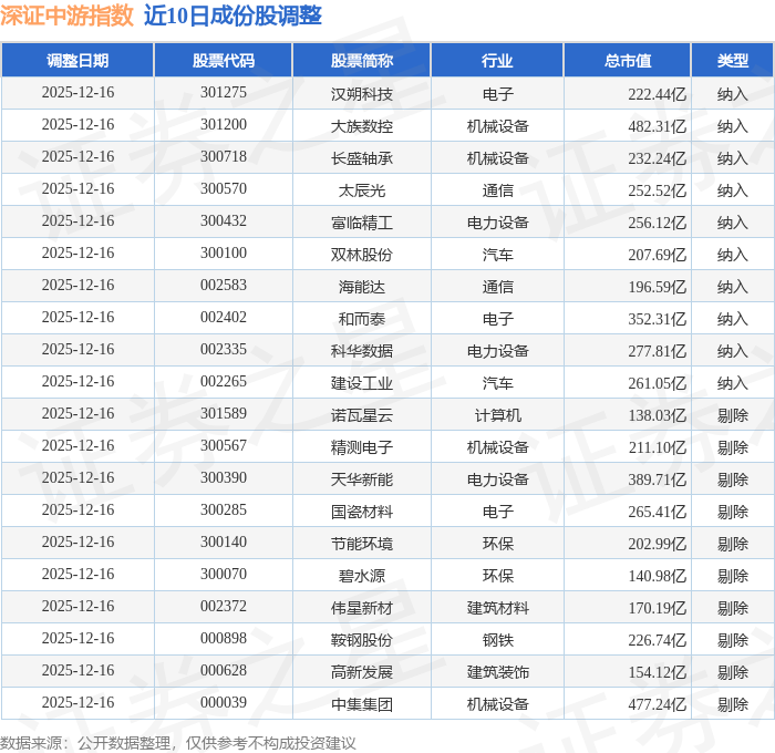 近10日内深证中游(399705)指数成份股做了调整,新纳入了10只股票,剔除了10只股票。